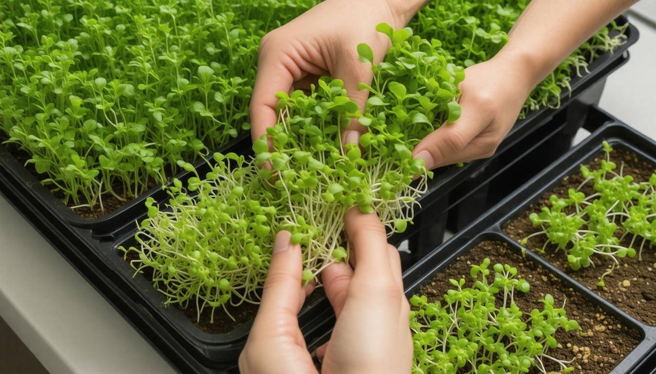 Next, select the area you want to harvest. It’s essential to look for plants that show healthy growth with vibrant colors—these are indicators of ready-to-harvest greens. Once you’ve identified your target, gently snip the greens just above the soil level. This method ensures minimal disturbance to the roots, allowing any remaining shoots in the tray to thrive without interruption.